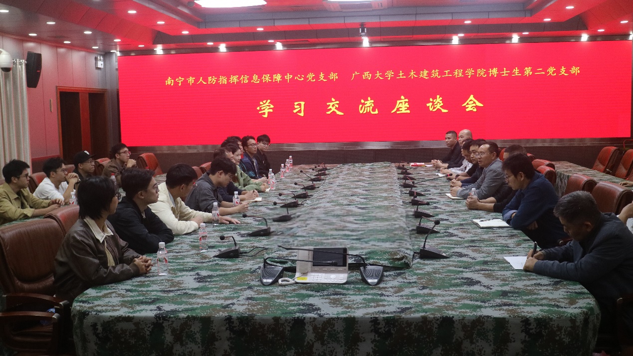 为深入学习贯彻党的二十届四中全会精神,推动军民融合与国防动员能力建设高质量发展,11月12日下午,南宁市人防指挥信息保障中心党支部与广西大学土木建筑工程学院博士生第二党支部联合开展主题党日联建活动。活动以“支部联建聚合力 人防研学固国防”为主题,通过理论学习、宣传观摩与交流研讨,深化了双方党员对国防动员工作的理解与责任担当。